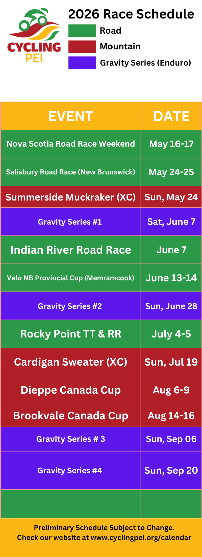 Check the calendar or click on the button below to see upcoming events and races hosted by Cycling PEI, as well as other cycling events happening in PEI and the Maritimes.